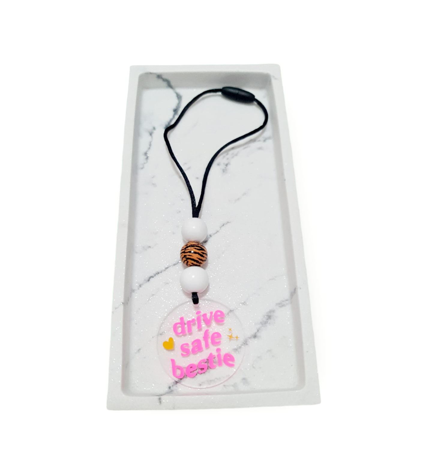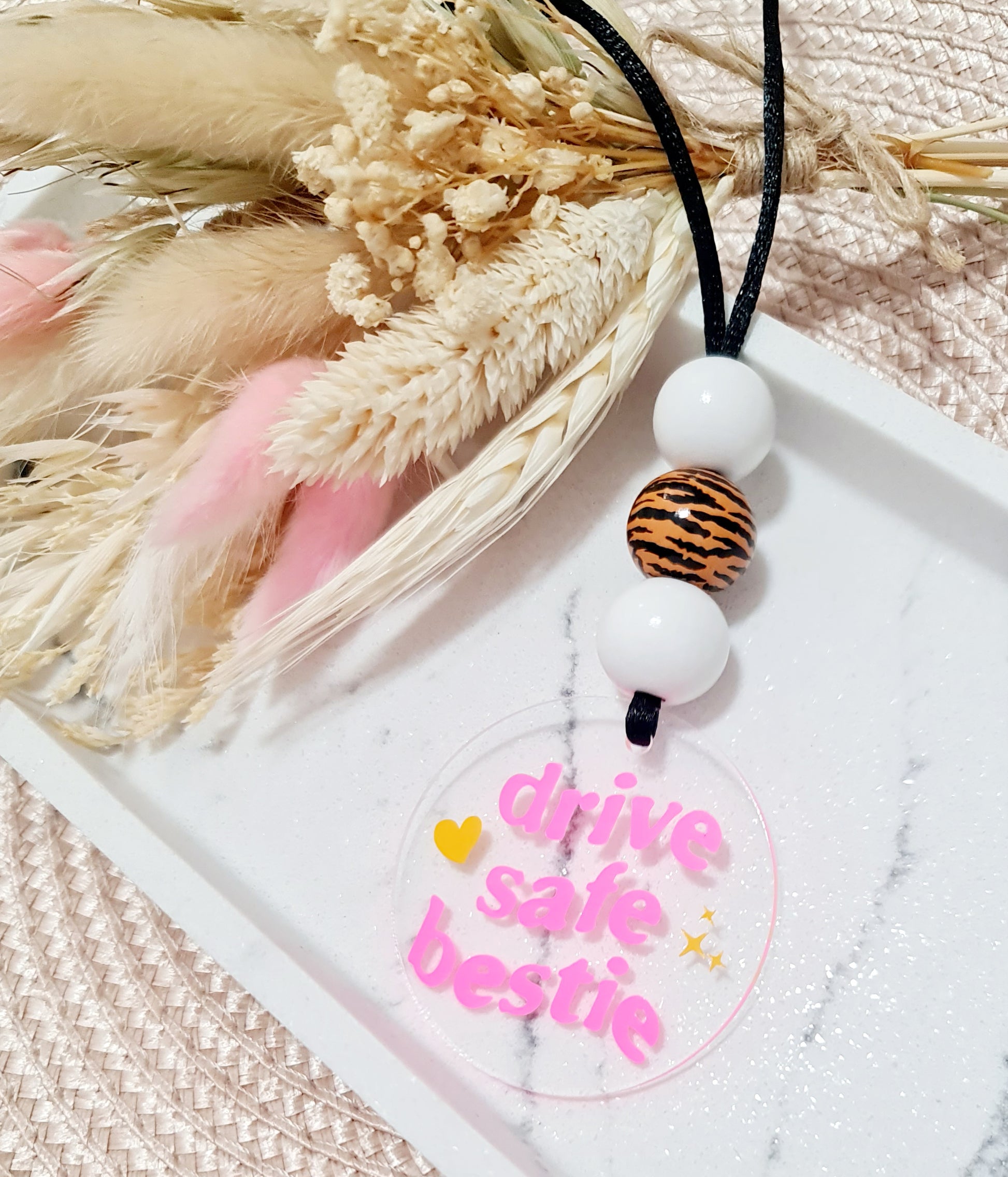 Keep your bestie close while driving with our "Drive Safe Bestie" hanging car mirror charm. A unique accessory that adds a fun touch to your car, while reminding you to stay safe on the road. The perfect gift for your best friend who loves to drive (and may need a little reminder to do so safely)!