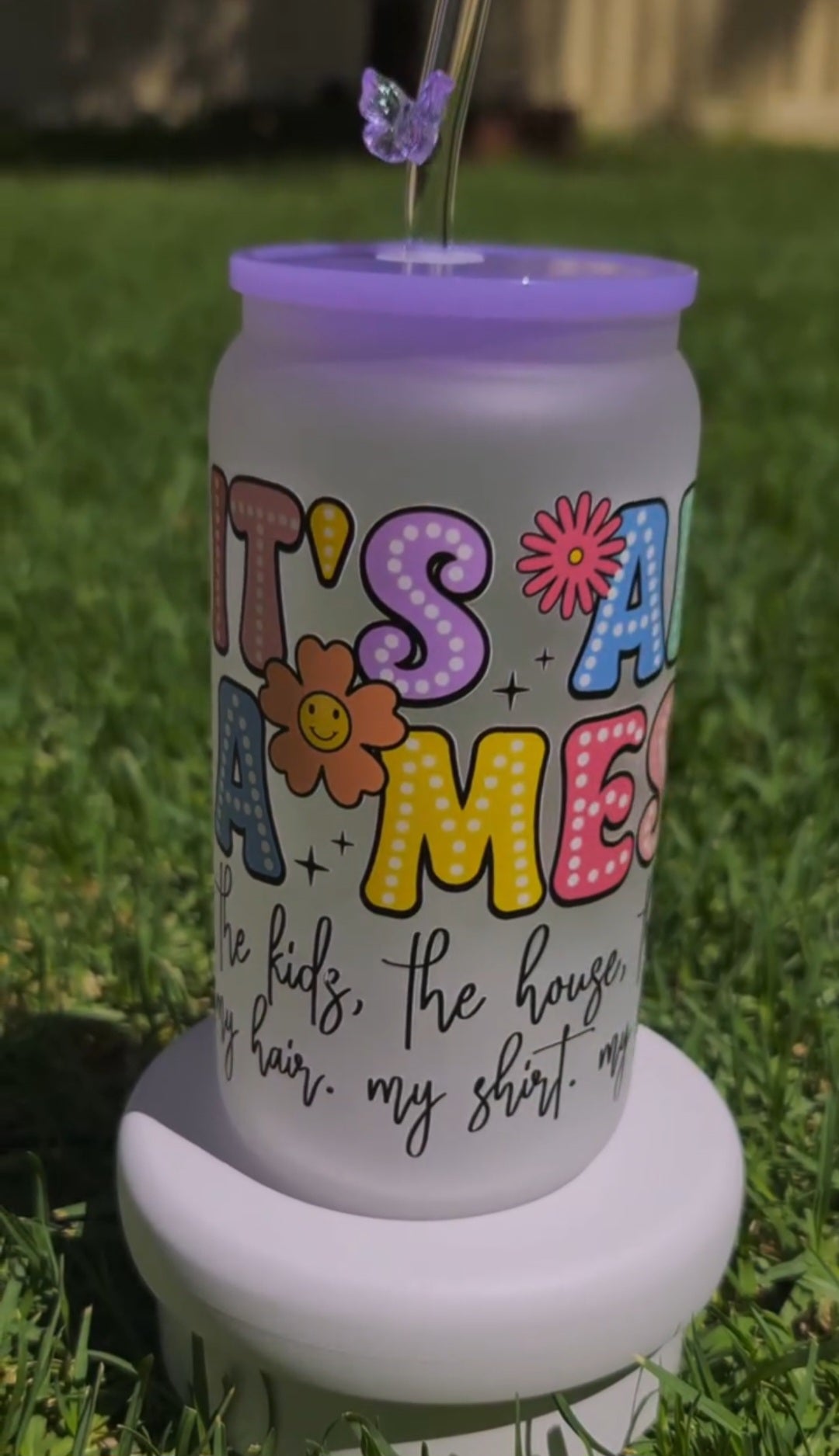 Comes with purple acrylic lid and a glass straw (no butterfly attached)