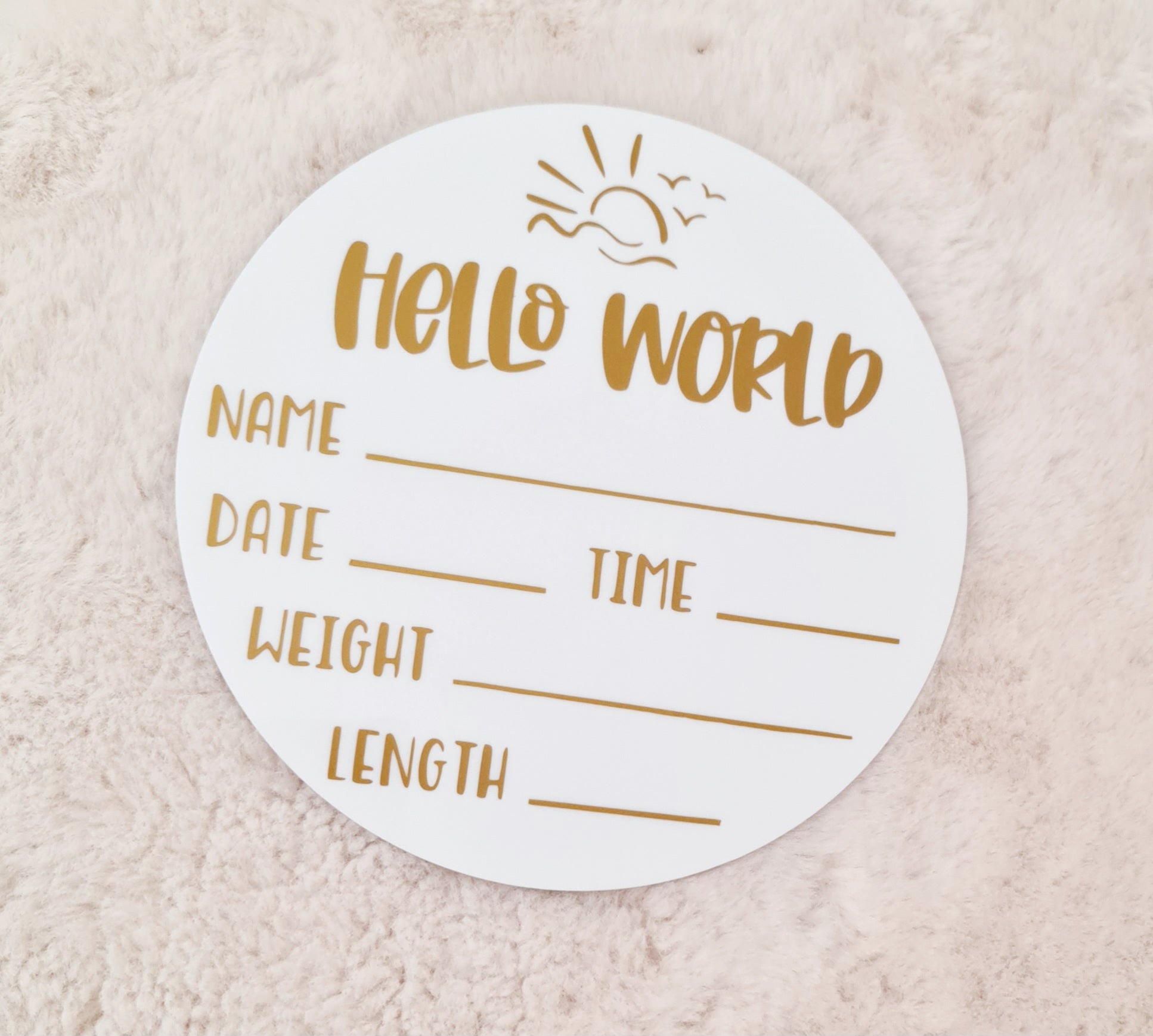 Introduce your new bundle of joy with our "Hello world" baby announcement plaque. This beautiful keepsake is the perfect way to share your exciting news with family and friends. Celebrate your growing family with this special addition to your home.