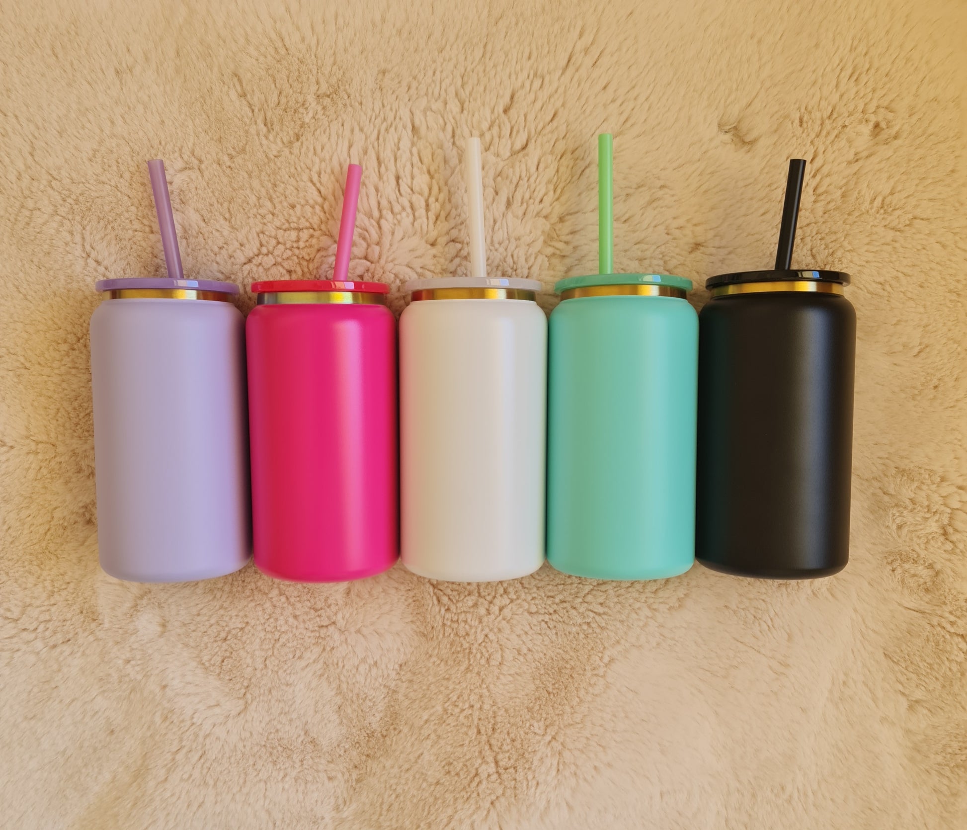 Stainless steel cups come with acrylic straw and matching acrylic lid.